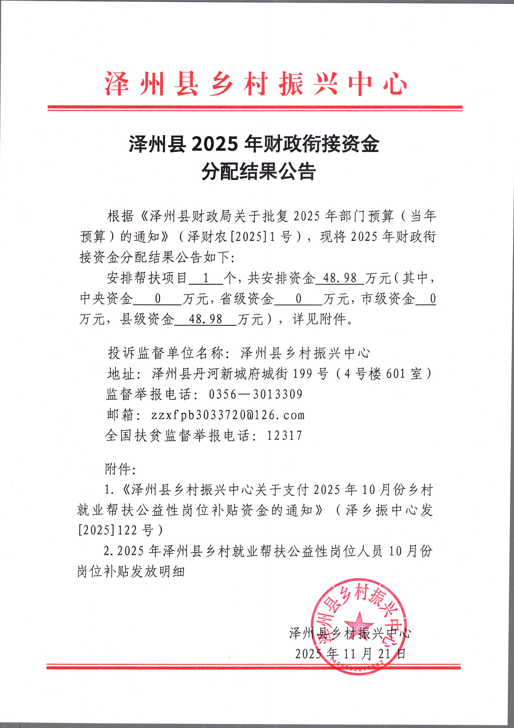 附件:附件1:泽州县乡村振兴中心关于支付2025年10月份乡村就业帮扶公益性岗位补贴资金的通知(泽乡振中心发[2025]122号).pdf