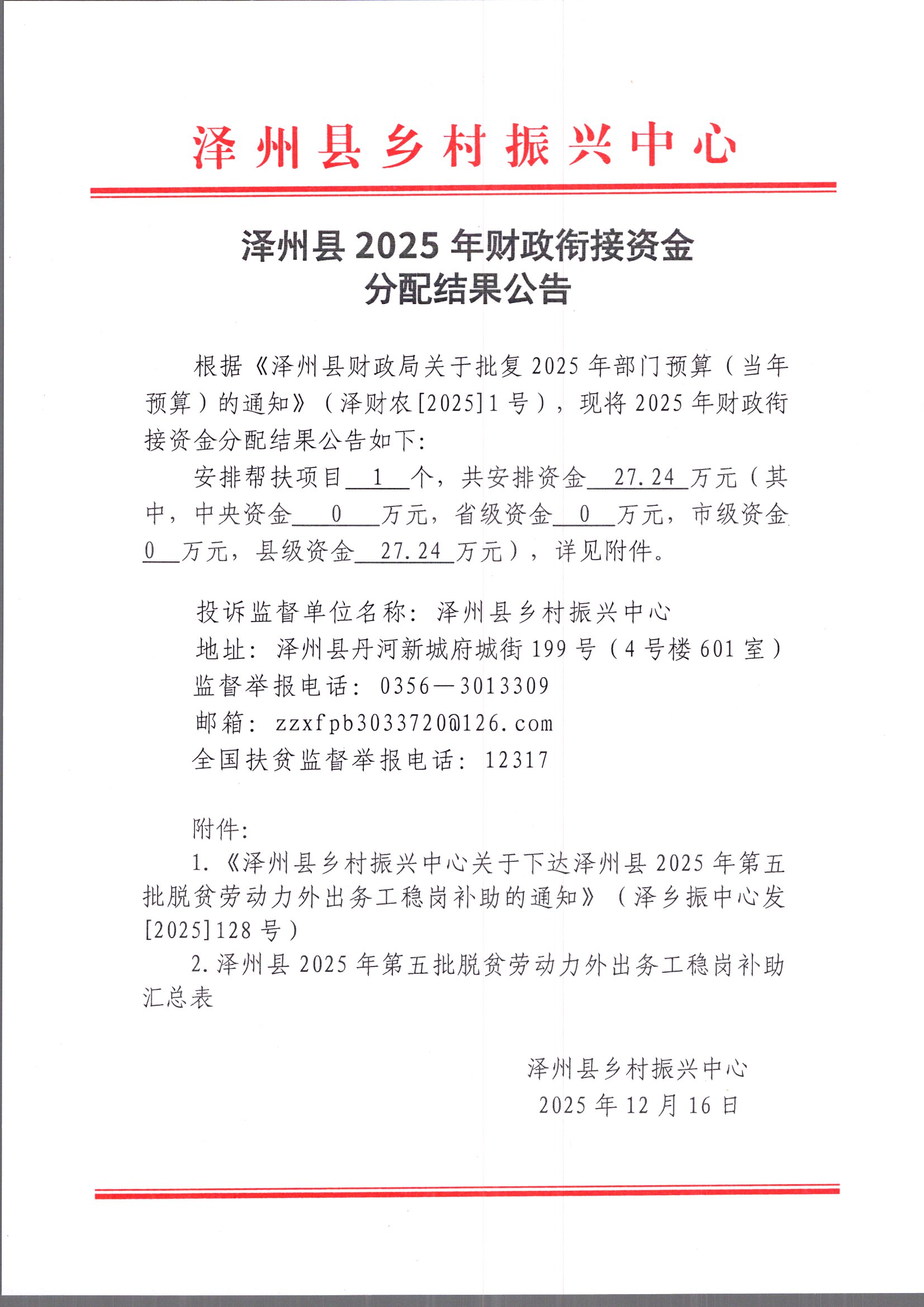 附件:附件1:《泽州县乡村振兴中心关于下达泽州县2025年第五批脱贫劳动力外出务工稳岗补助的通知》(泽乡振中心发[2025]128号) 12.16.pdf