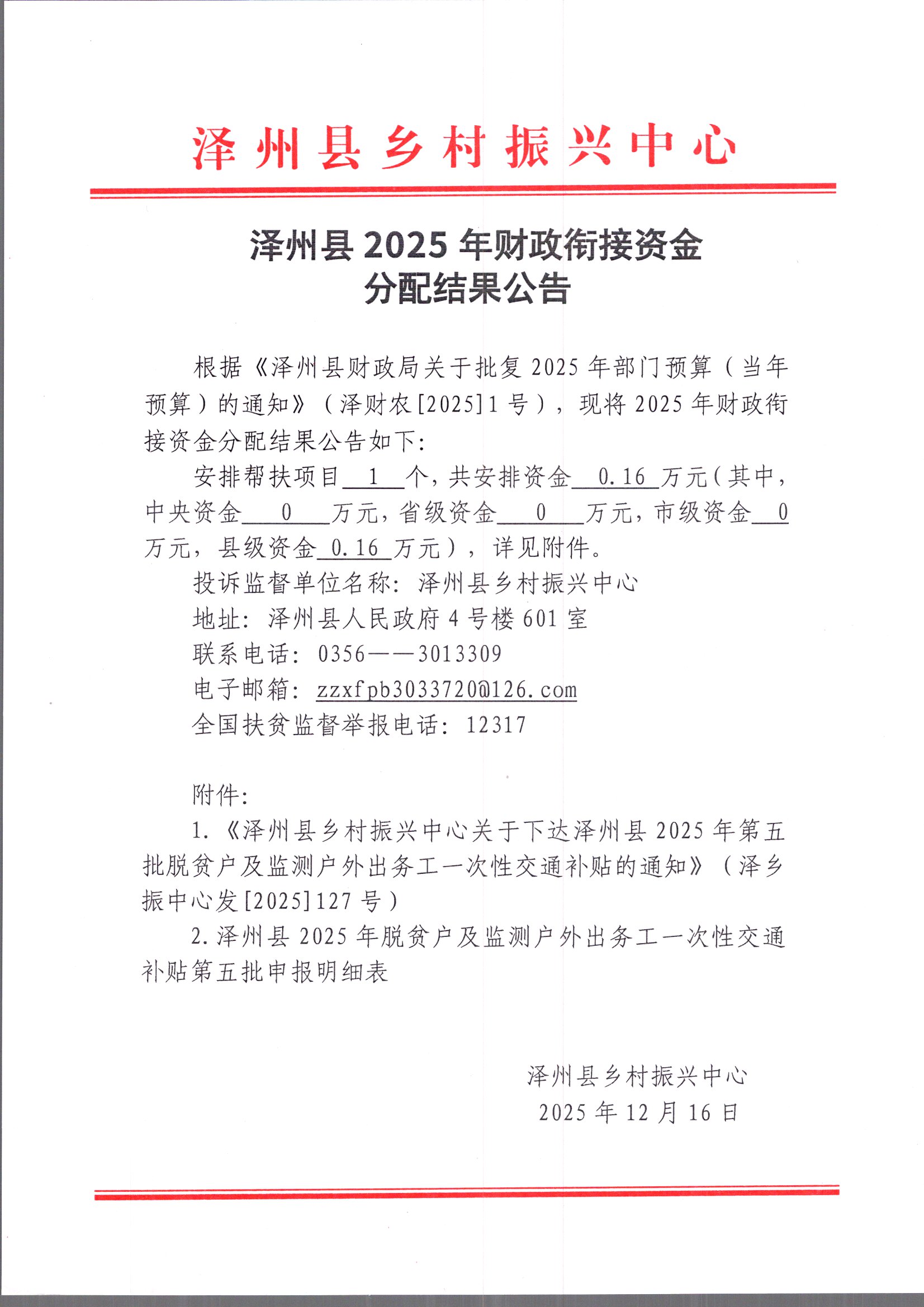 附件:附件1:《泽州县乡村振兴中心关于下达泽州县2025年第五批脱贫劳动力外出务工稳岗补助的通知》(泽乡振中心发[2025]128号) 12.16.pdf