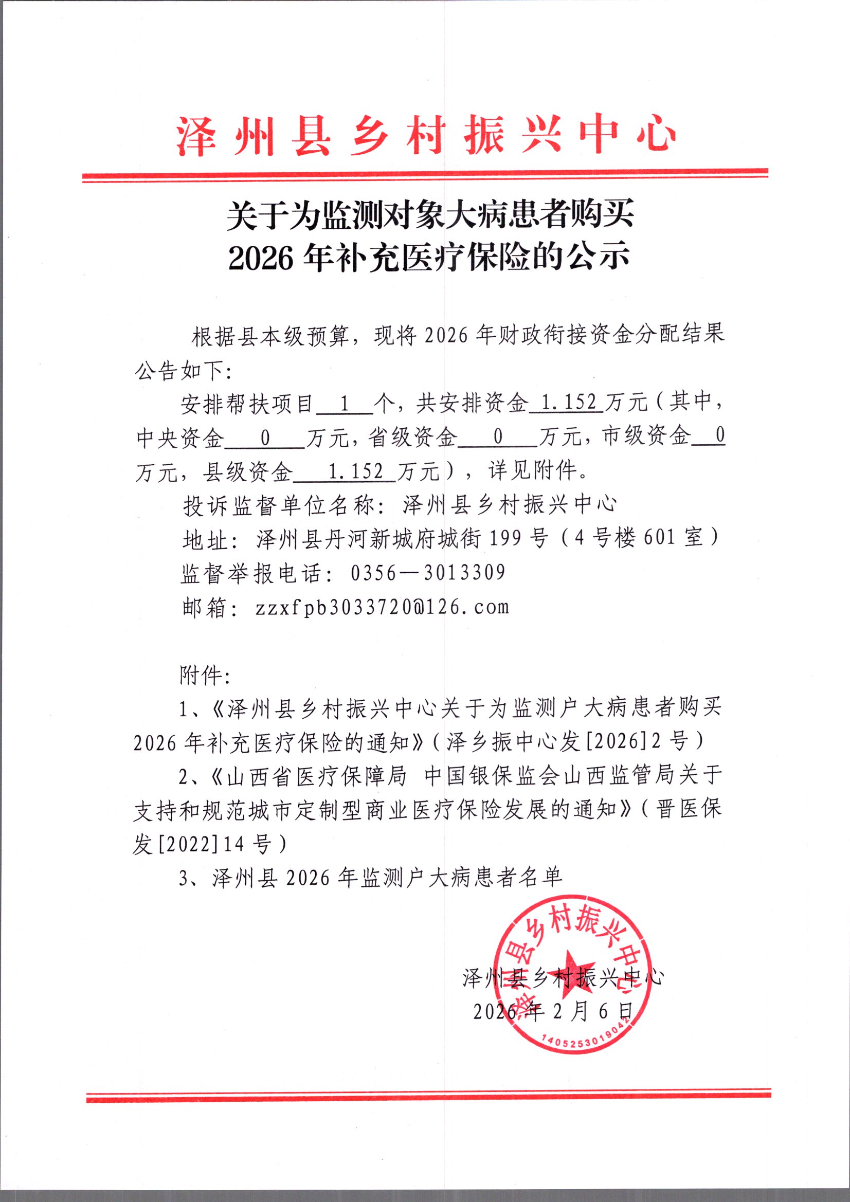 附件:附件1:《泽州县乡村振兴中心关于为监测户大病患者购买2026年补充医疗保险的通知》(泽乡振中心发[2026]2号).pdf