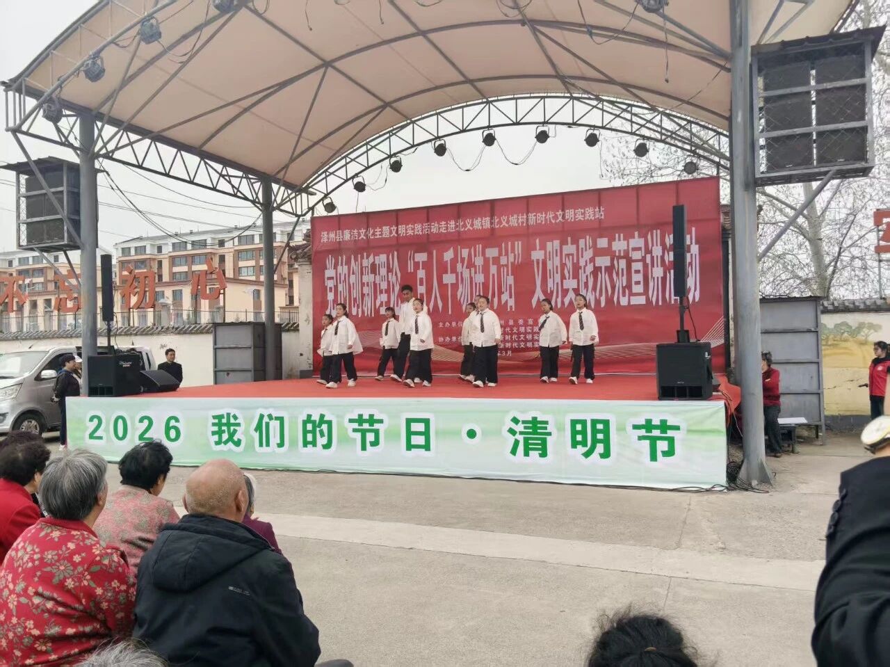 文艺展演环节,各类节目轮番登场、亮点纷呈,以群众喜闻乐见的形式弘扬清风正气、传递正能量。现场既有契合春日氛围的歌舞《春生万物》、独唱《春夜喜雨》,也有深受群众喜爱的经典上党梆子,更有礼赞英雄、缅怀先烈的萨克斯独奏《珊瑚颂》、诗朗诵《不朽》等红色经典节目。值得一提的是,北义城小学的学生们带来了特色课间操——曳步舞,少年们朝气蓬勃、步伐整齐,尽显阳光向上的精神风貌,为整场活动增添了满满朝气与活力。