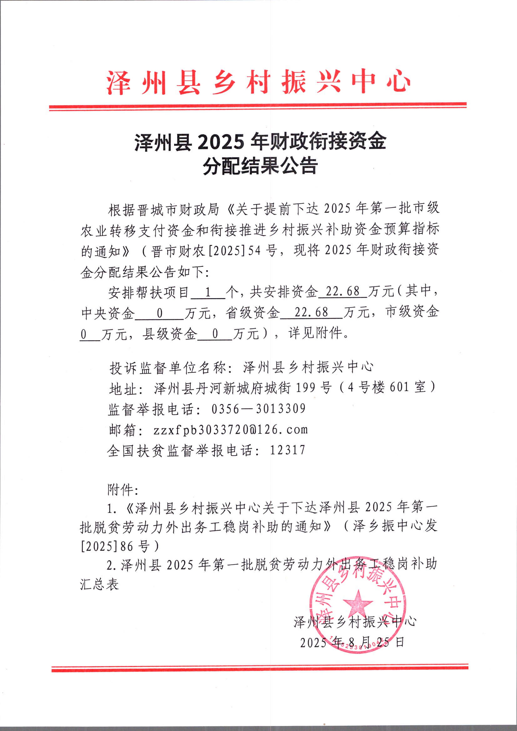 附件:附件1:《泽州县乡村振兴中心关于下达泽州县2025年第一批脱贫劳动力外出务工稳岗补助的通知》(泽乡振中心发[2025]86号).pdf