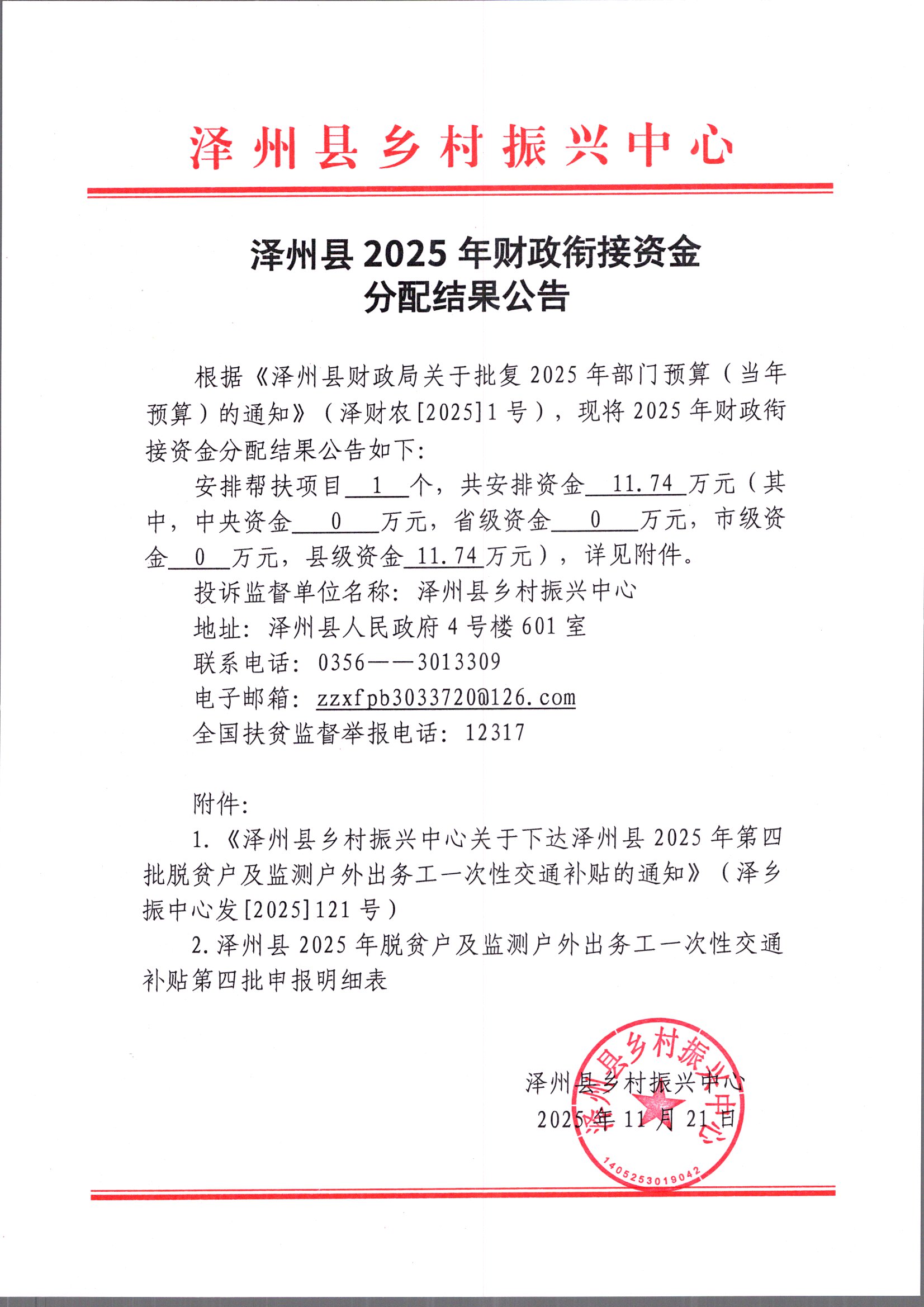 附件:附件1:泽州县乡村振兴中心关于下达泽州县2025年第四批脱贫户及监测户外出务工一次性交通补贴的通知(泽乡振中心发[2025]121号).pdf
