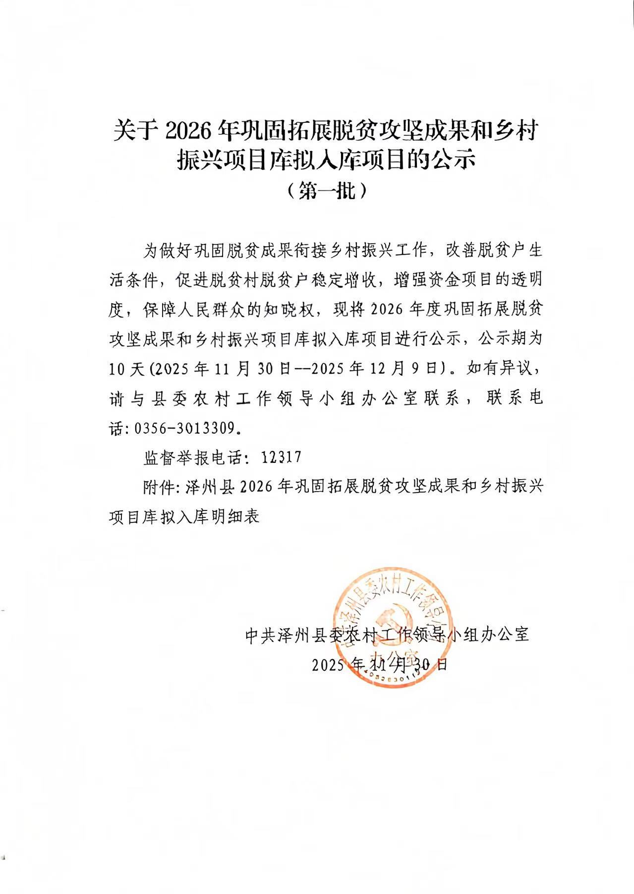关于2026年巩固拓展脱贫攻坚成果和乡村振兴项目库拟入库项目的公示(第一批)