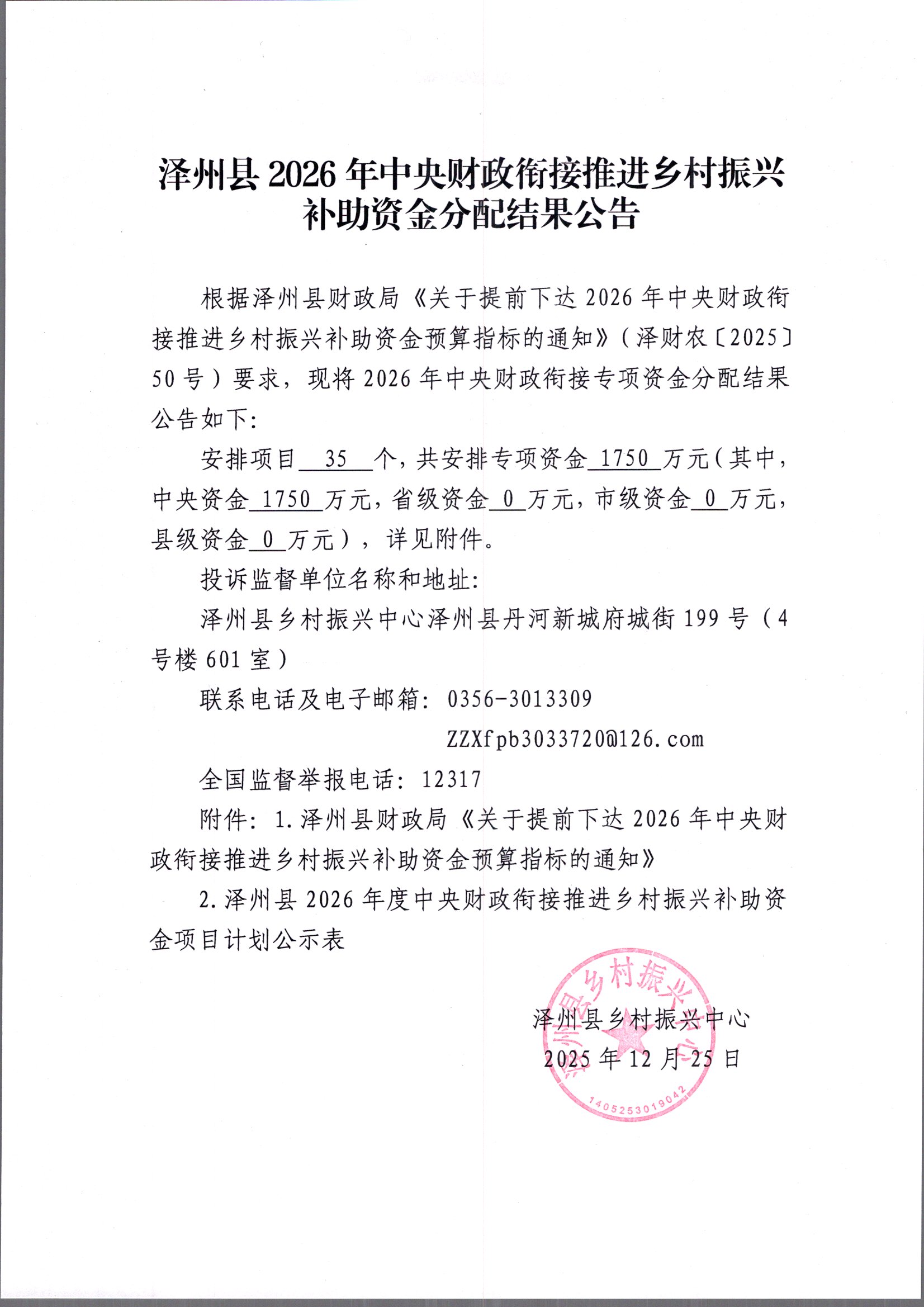 泽州县2026年中央财政衔接推进乡村振兴补助资金分配结果公告