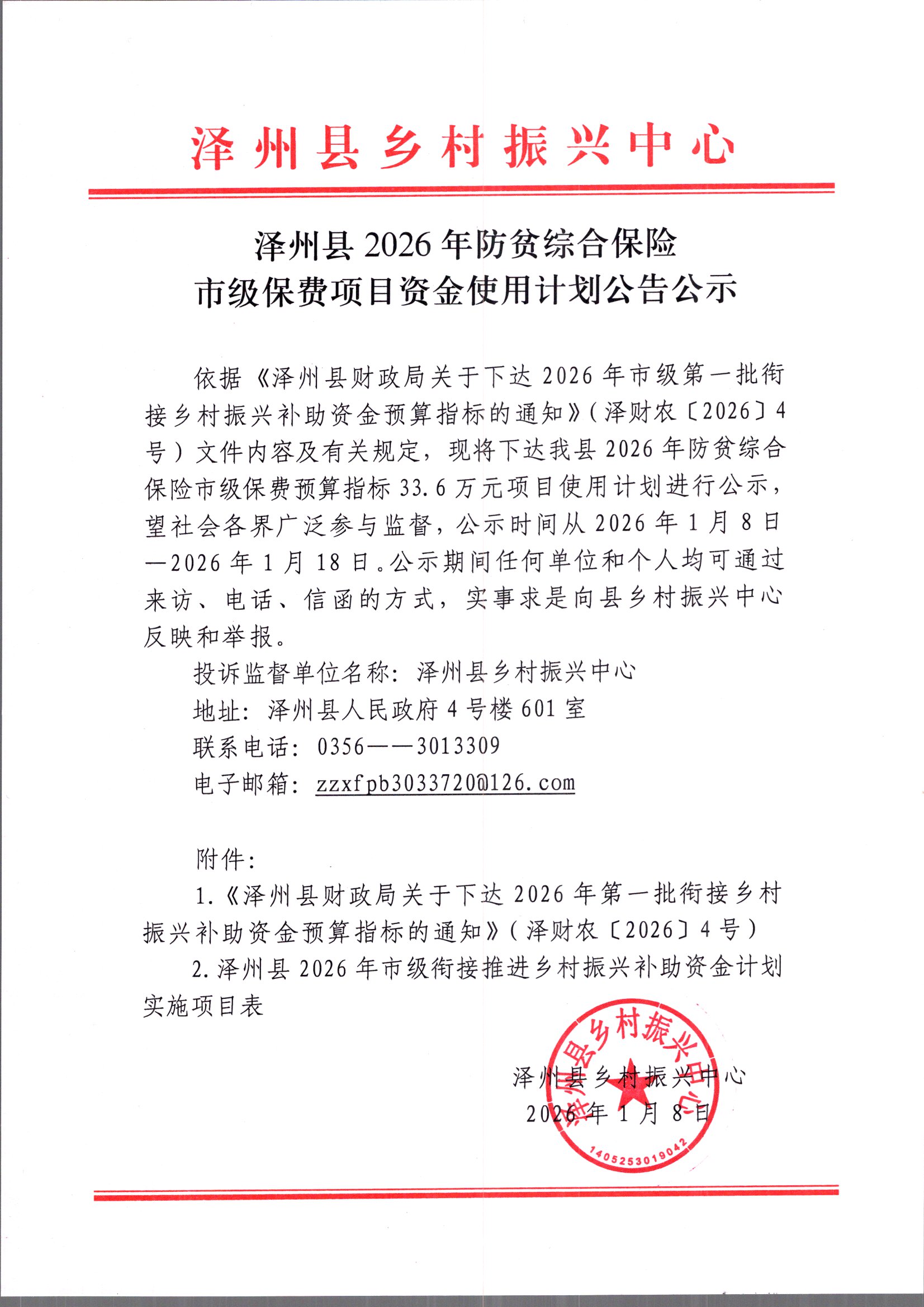 泽州县2026年防贫综合保险市级保费项目资金使用计划公告公示