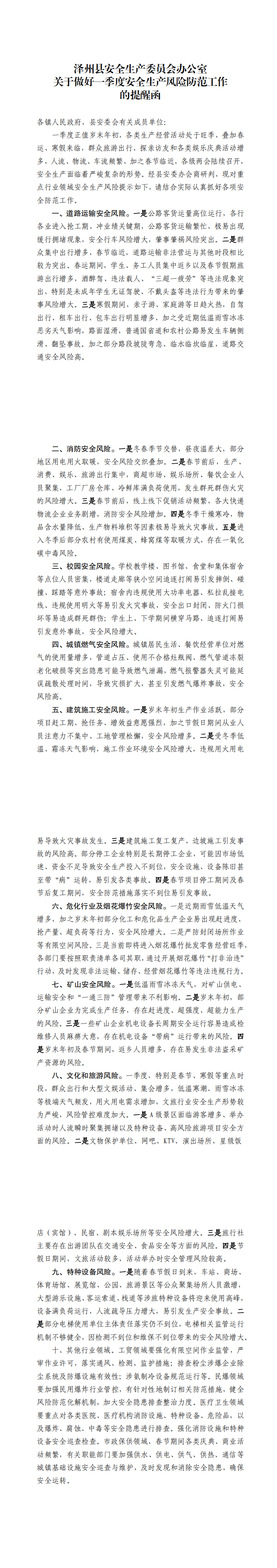 泽州县安全生产委员会办公室 关于做好一季度安全生产风险防范工作的提醒函