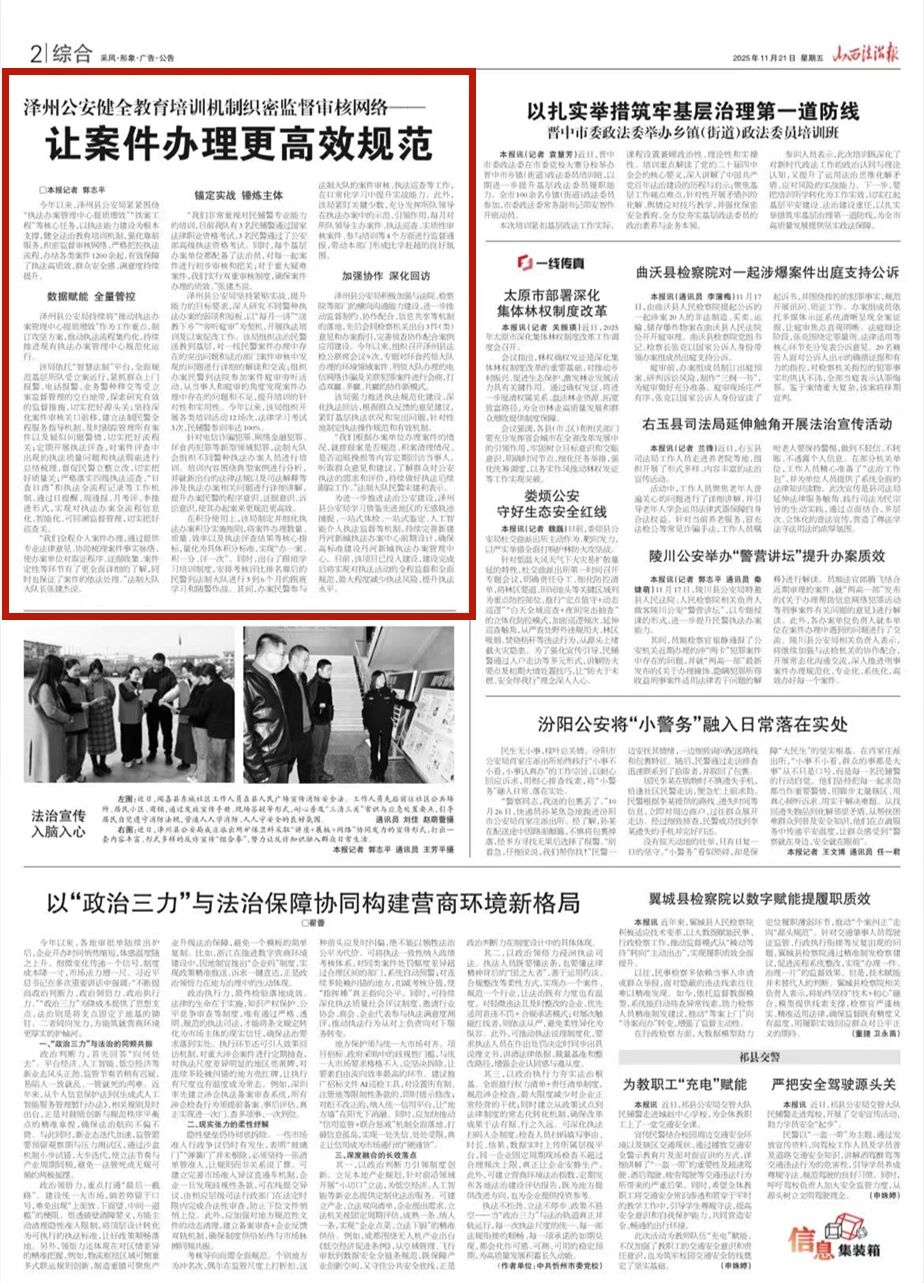 今年以来,泽州县公安局紧紧围绕“执法办案管理中心提质增效”“铁案工程”等核心任务,以执法能力建设为根本支撑,健全法治教育培训机制,强化靠前服务,织密监督审核网络,严格把控执法流程,办结各类案件1200余起,有效保障了执法高质效,群众安全感、满意度持续提升。
