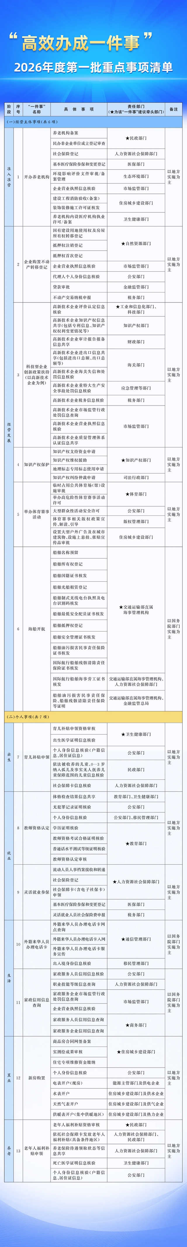 国务院办公厅12日对外发布《“高效办成一件事”2026年度第一批重点事项清单》,包含个人和经营主体事项共13项。