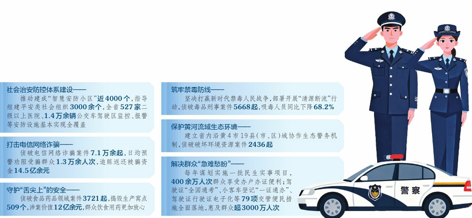 助力黄河流域生态环境保护方面。建立省内沿黄4市19县(市、区)域协作生态警务机制,侦破破坏环境资源案件2436起。目前,黄河流域优良水体比例达到90%,“两山”“七河”“五湖”很多地方成为热门打卡地。