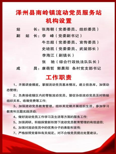 建机构。在市区设立流动党员服务站,以流动党员服务站为“根据地”,优化服务站机构设置,建立以乡镇组织委员为站长,各片长为副站长,各村支部书记为管理成员的组织机构,为流动党员提供登记报到、政策咨询、就业指导等服务。