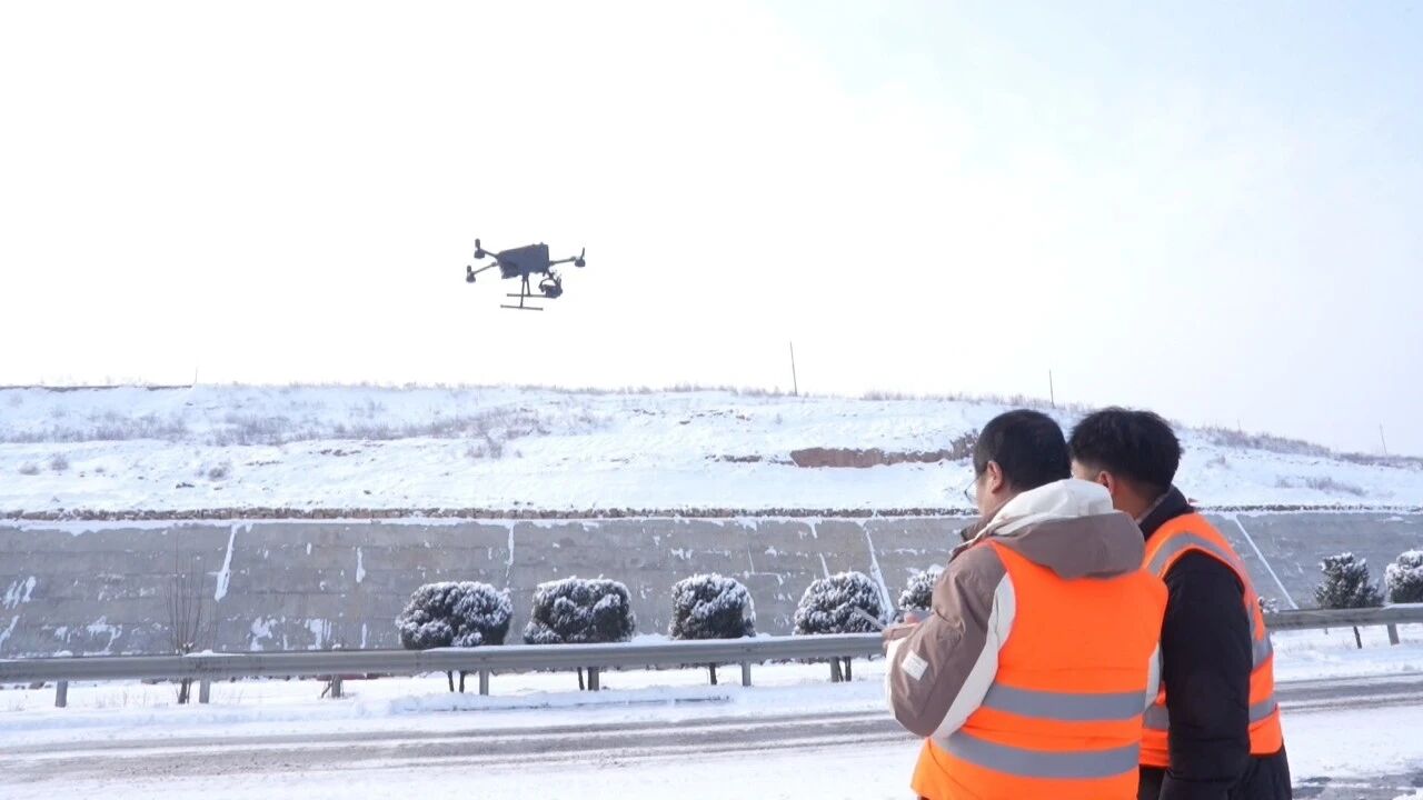 在国道208金匠段,公路养护人员正利用无人机进行高空巡航,通过精准探测,为除雪机械出动路线和养护人员作业重点提供精确的数据支撑。