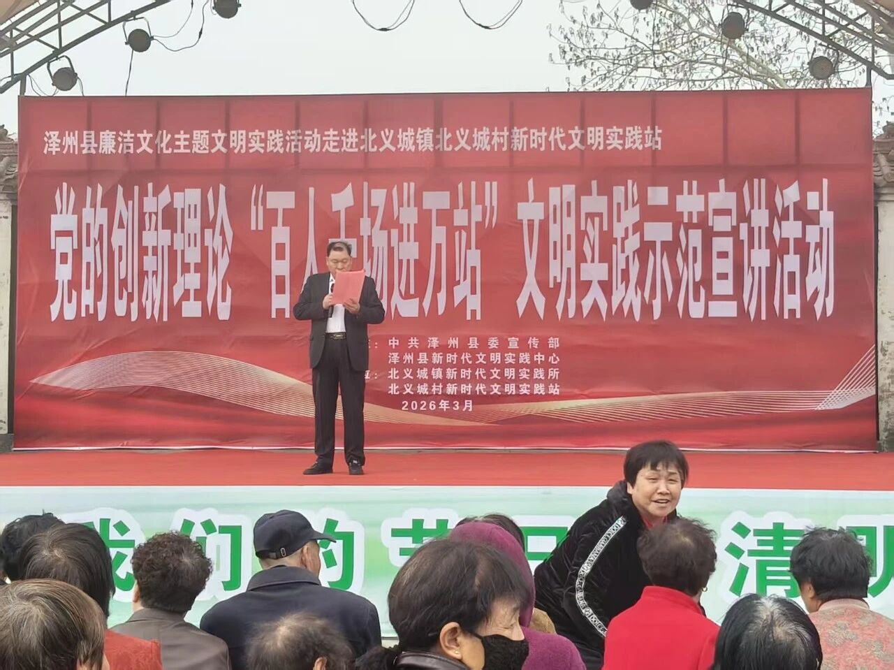 3月26日下午,泽州县委宣传部、县新时代文明实践中心联合北义城镇新时代文明实践所举办的党的创新理论“百人千场进万站”文明实践示范宣讲活动走进北义城。本次活动紧扣廉洁文化建设主线,统筹理论宣讲、文艺展演、文明集市、“我们的节日·清明”主题实践多项内容,让党的好声音传遍乡间角落,让清正廉洁的新风正气浸润民心。